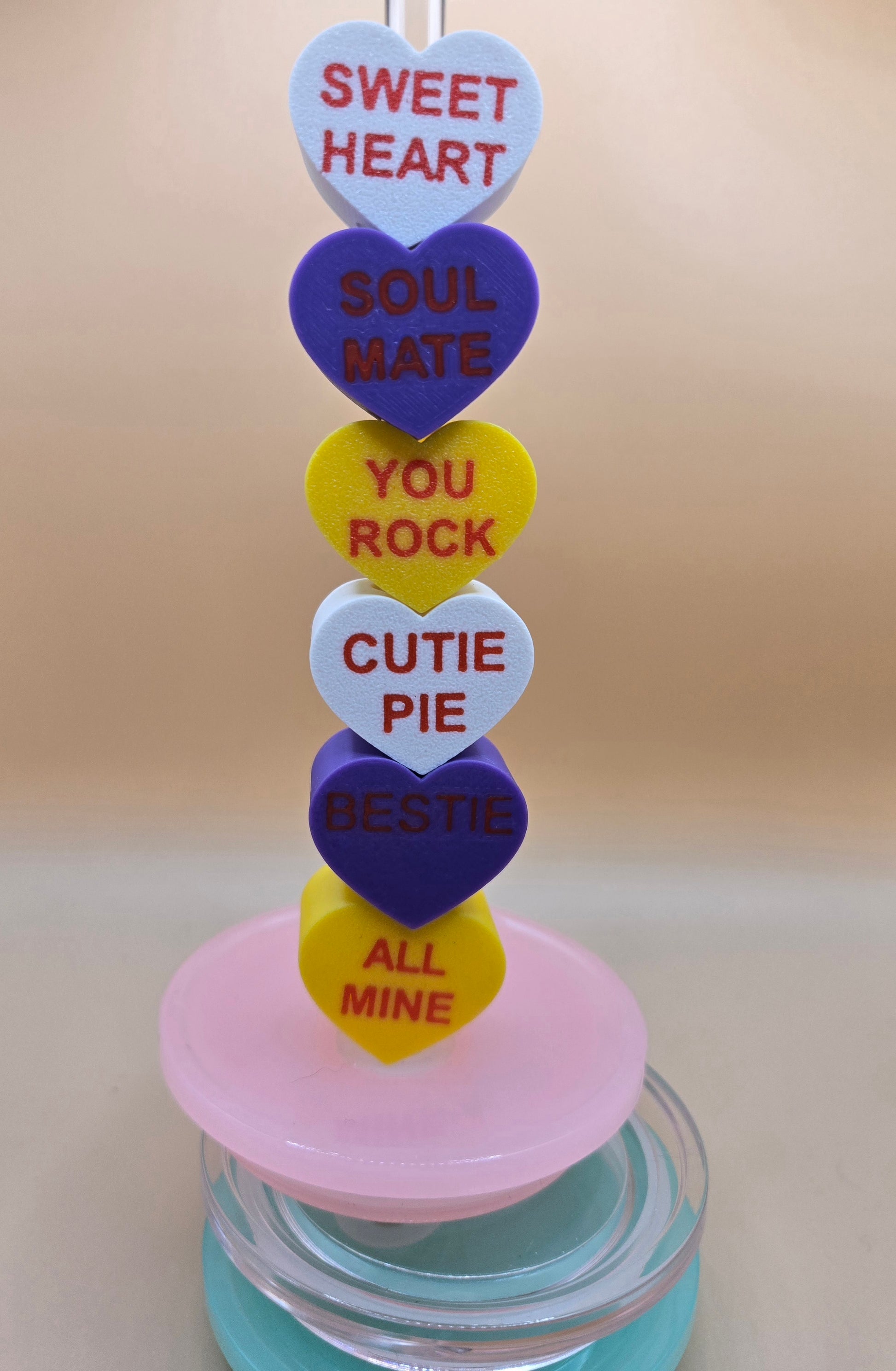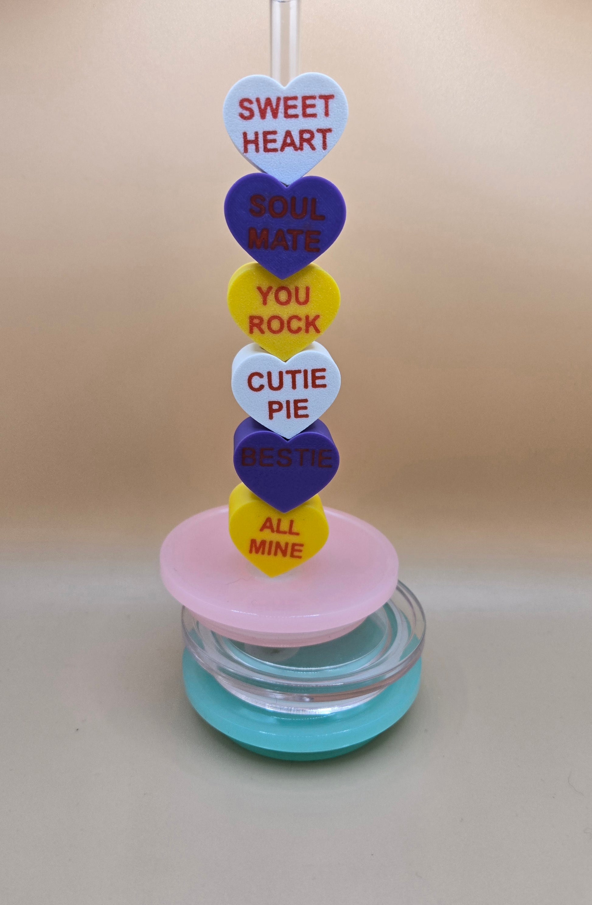 Small Candy Hearts Straw Topper. Comes with a variety of sayings. Does not come with cup show in picture.