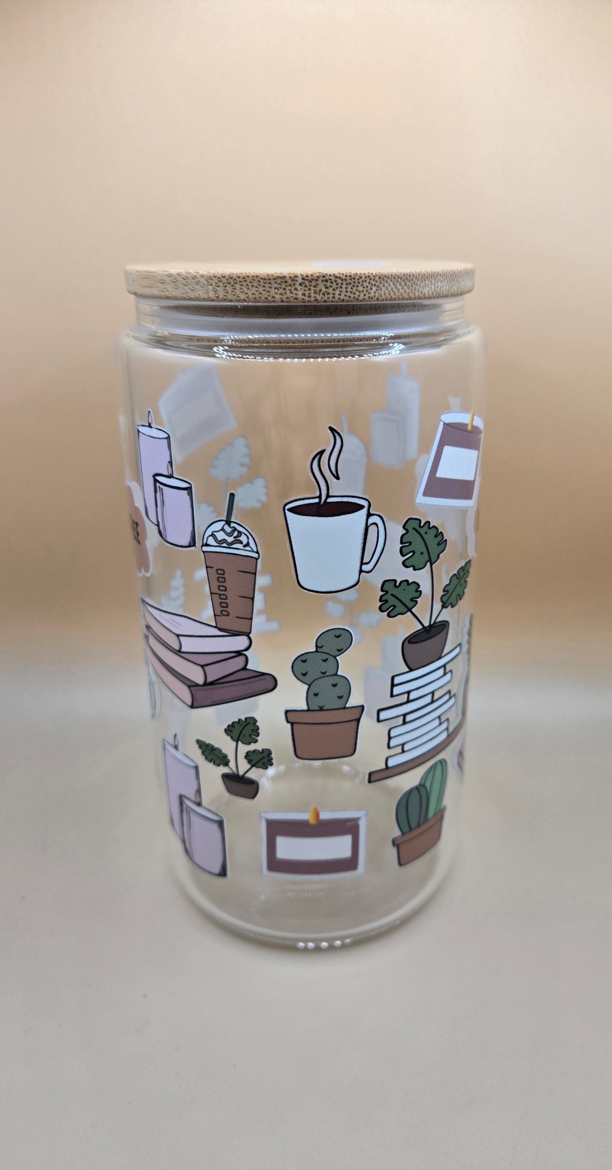 16 oz glass Books and Coffee cup. Comes with glass straw but if you want plastic please let us know.