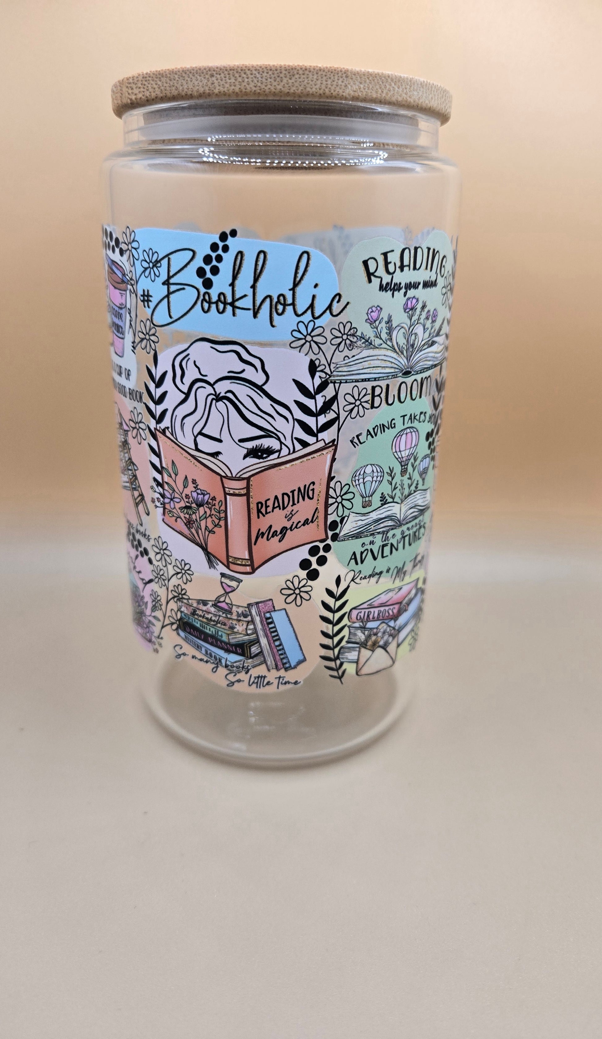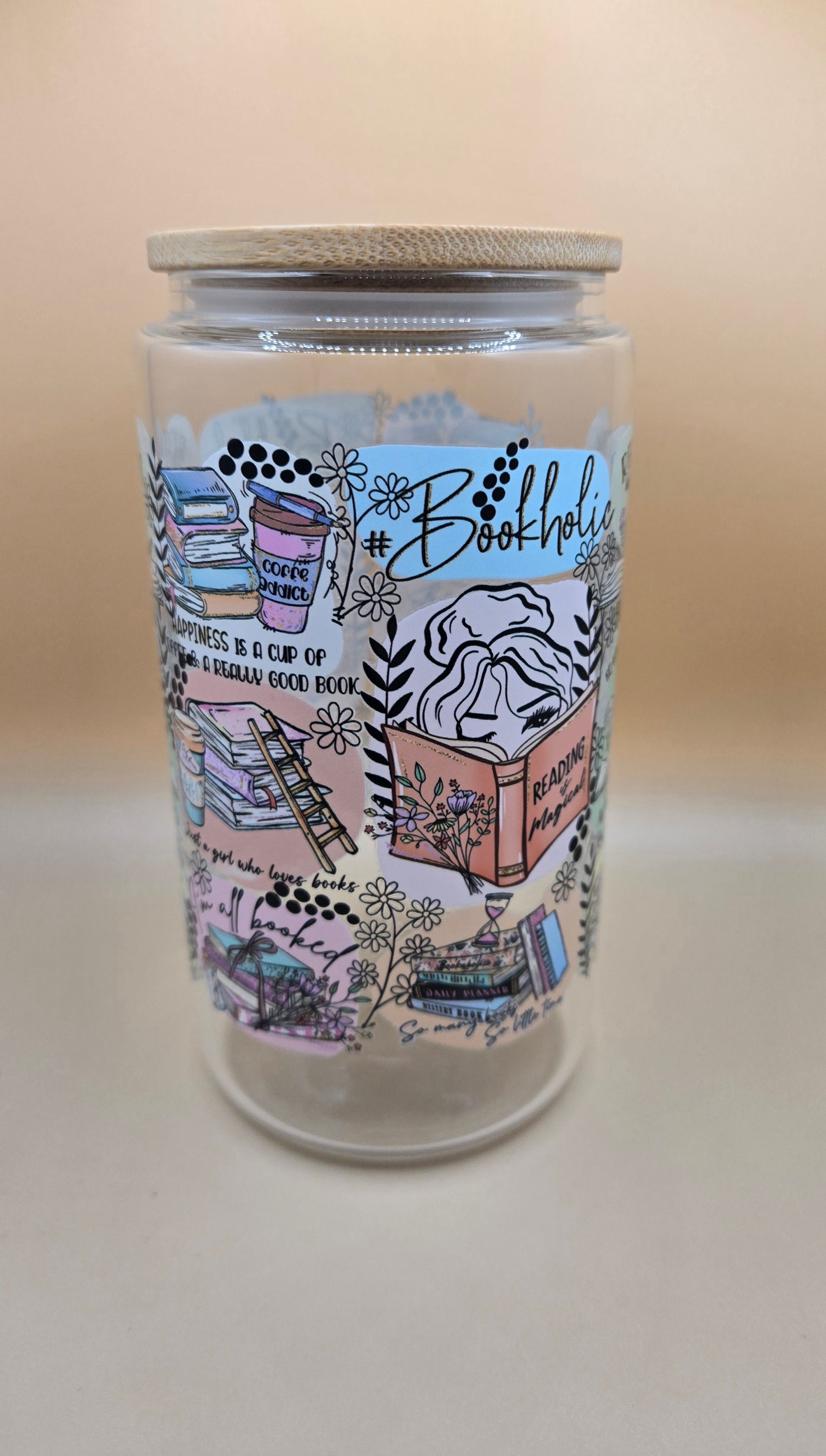 16 oz Glass Bookholic cup. Comes with glass straw but if you want plastic please let us know.