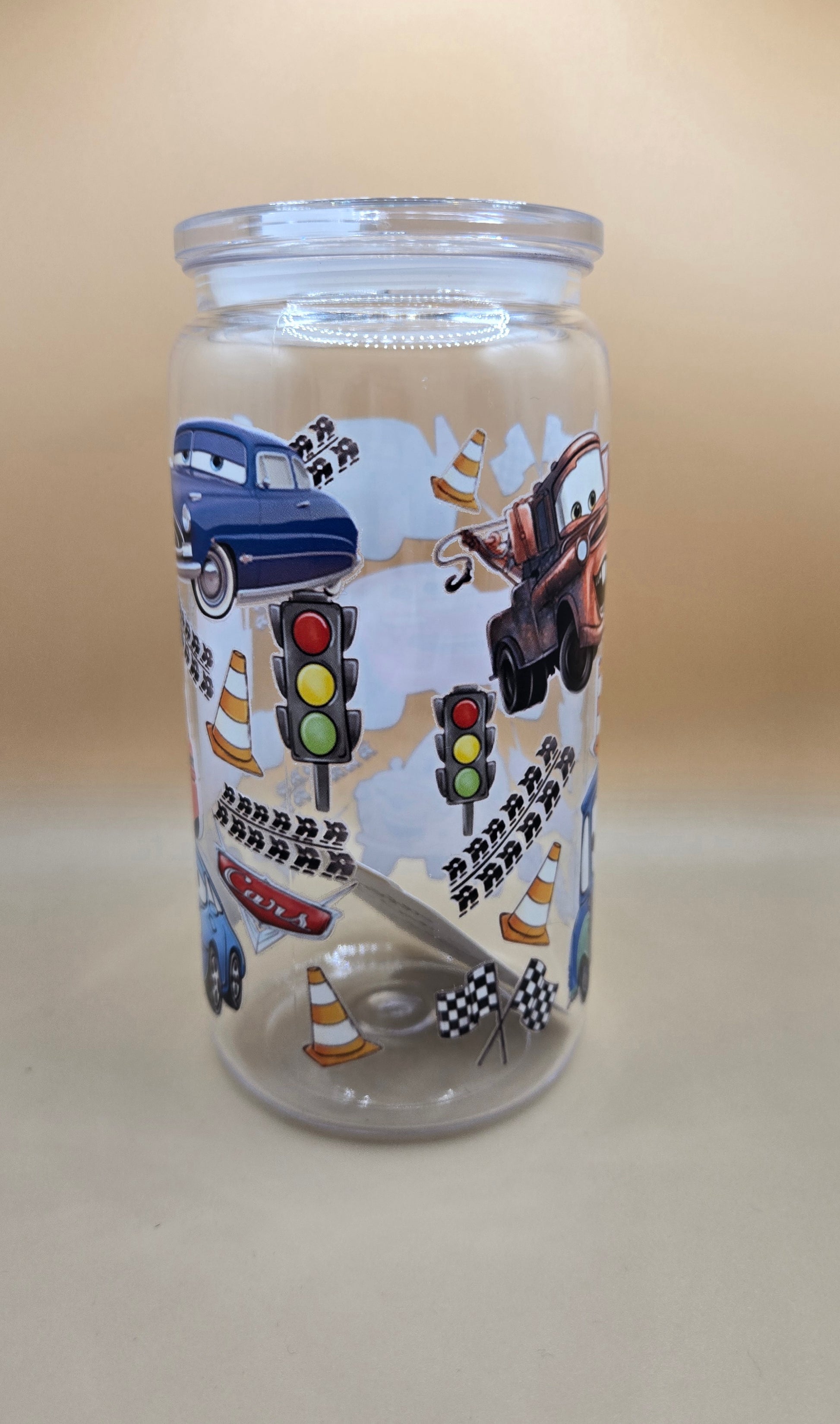 16 oz Plastic Cars cup. Comes with plastic Straw.