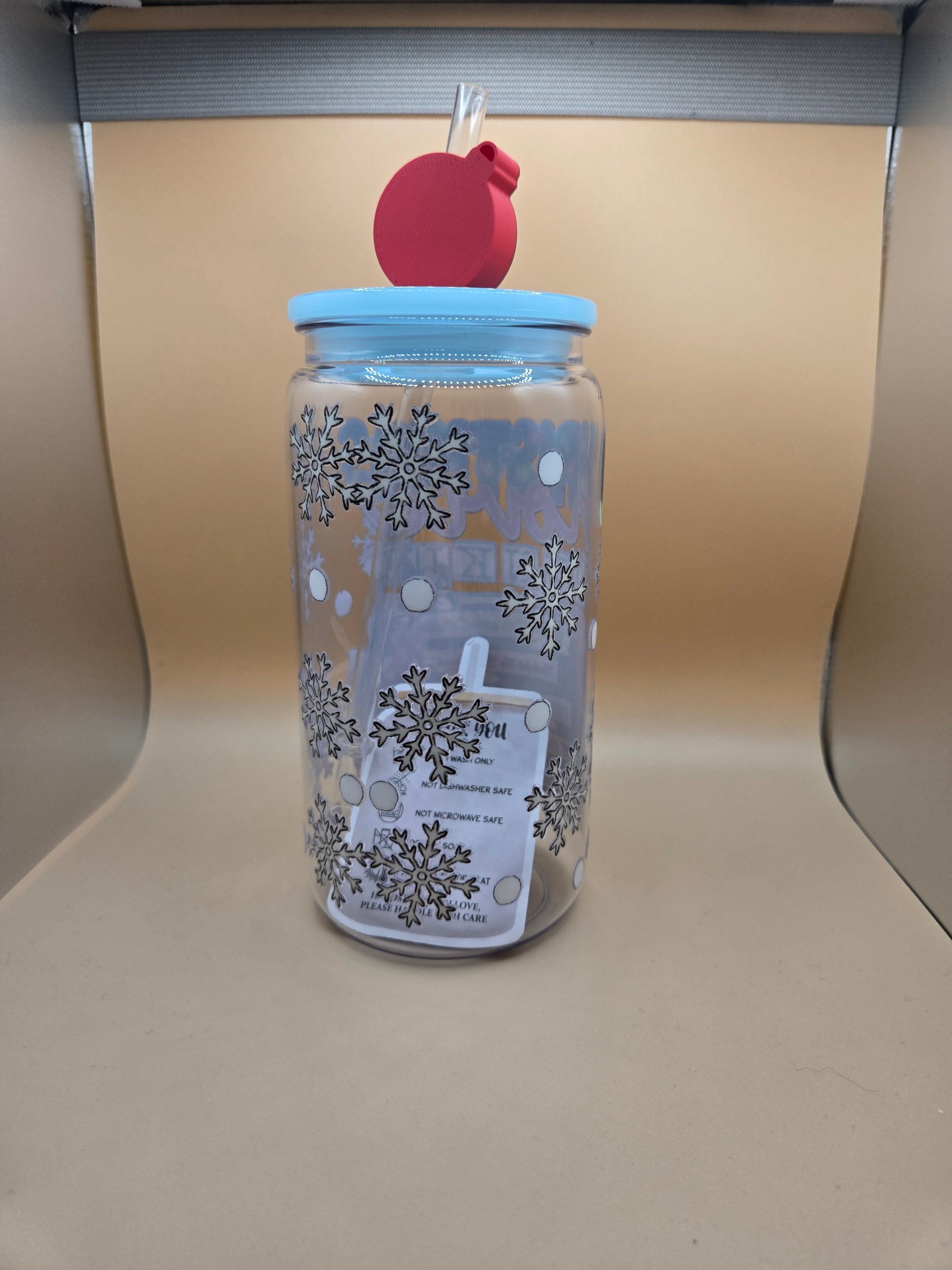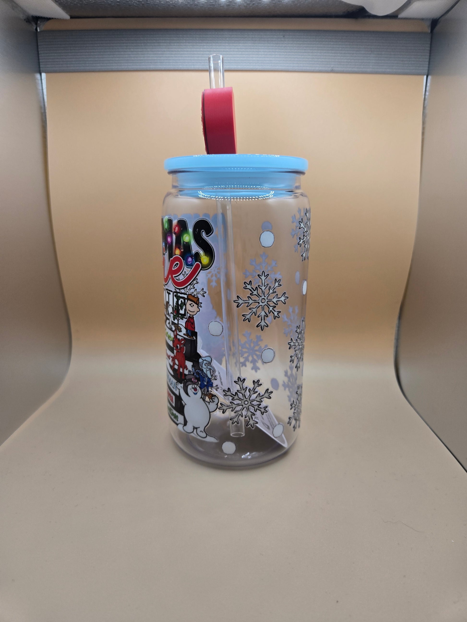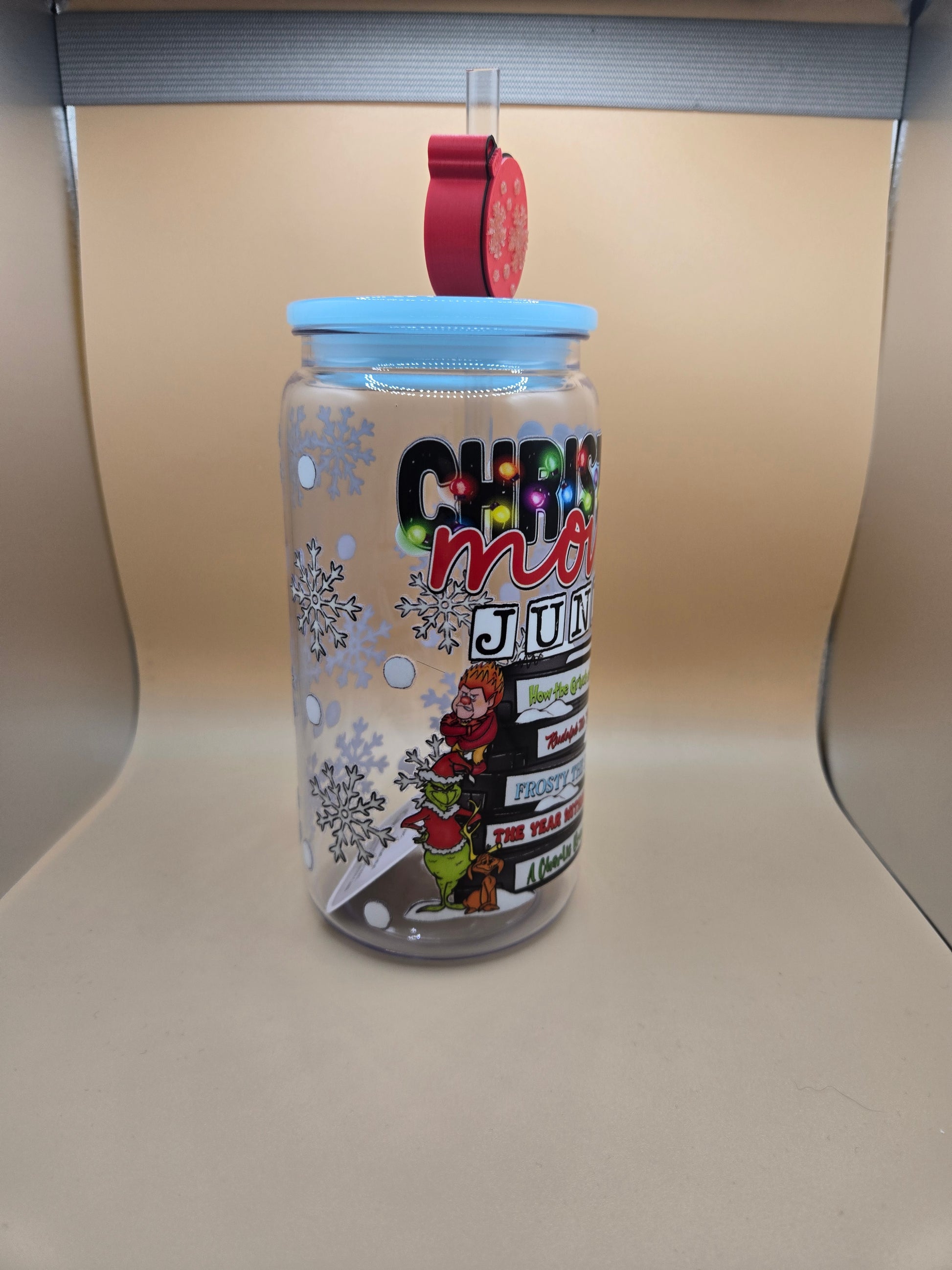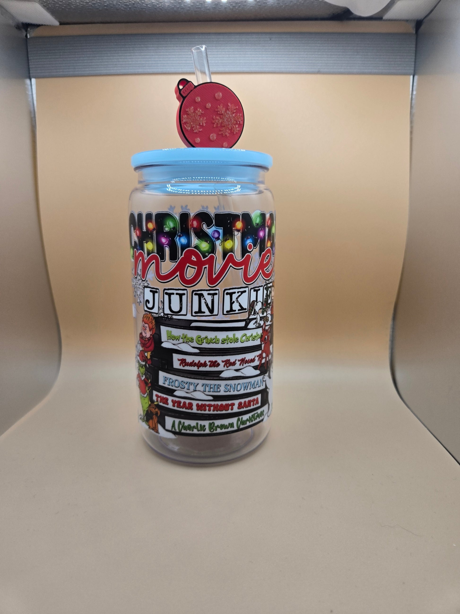 16 oz Plastic cup with Christmas Movie Junkie and straw topper.