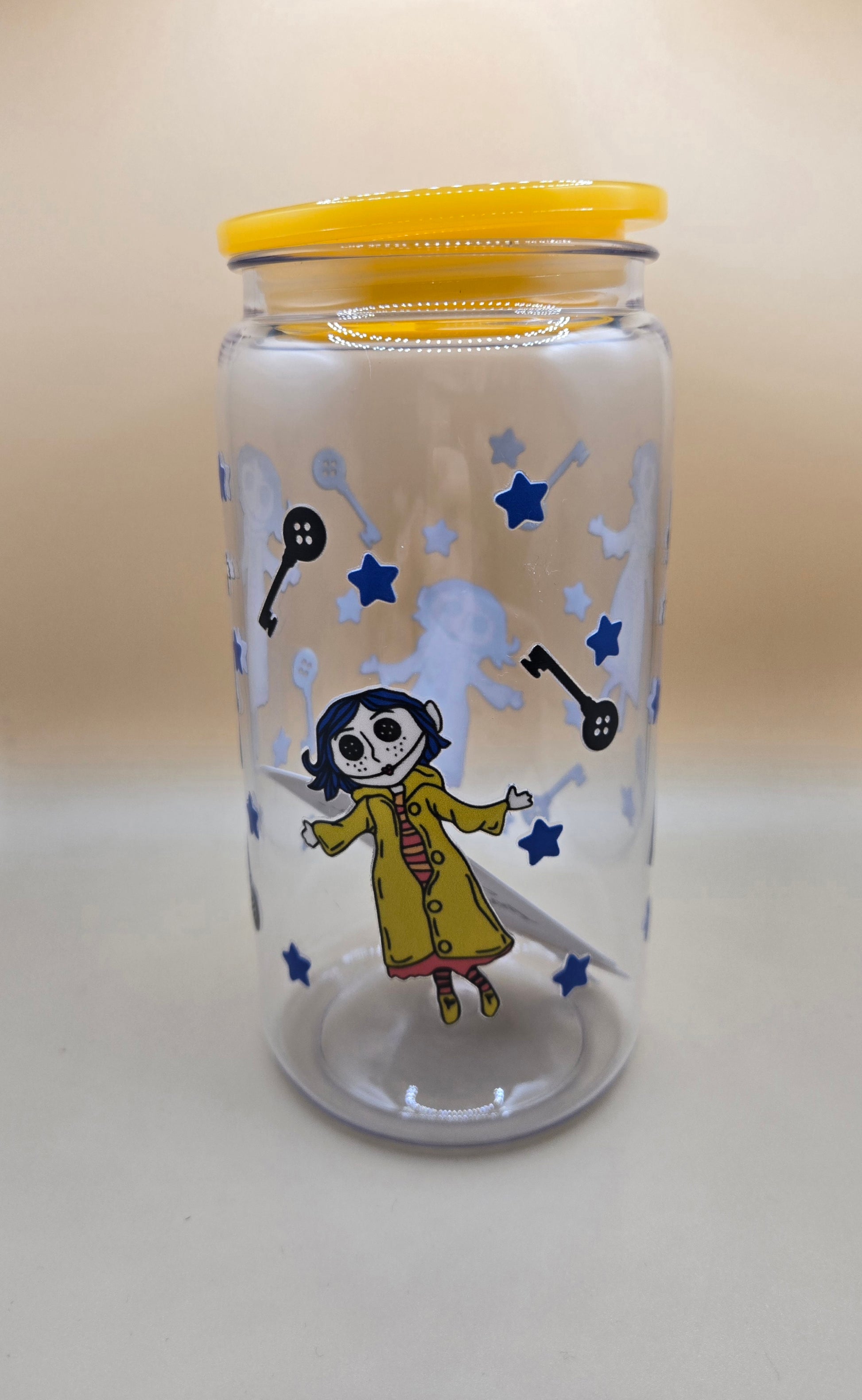 16 oz plastic Coraline cup. Comes with plastic Straw.