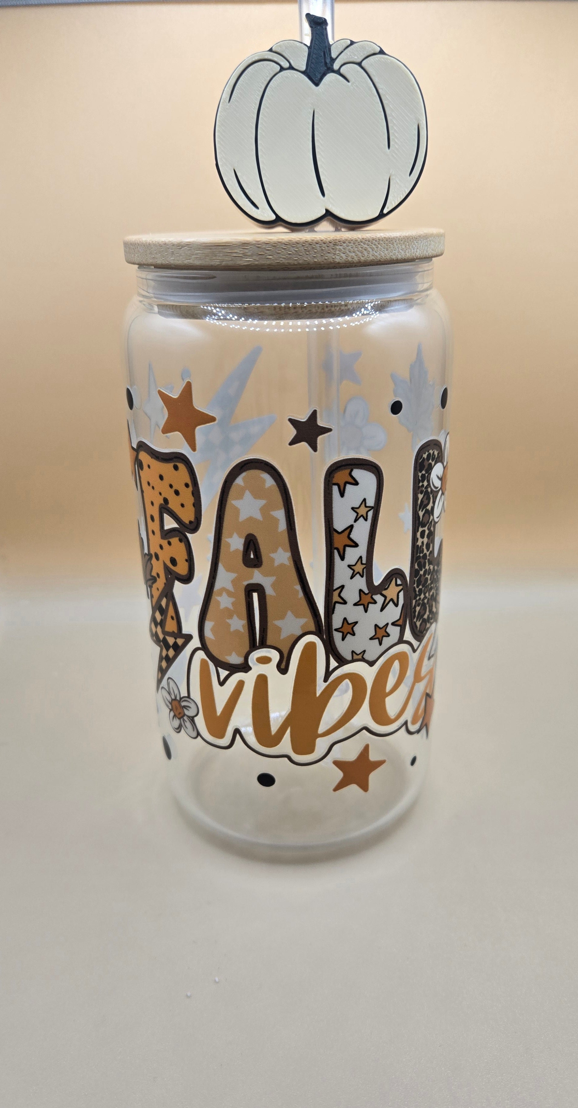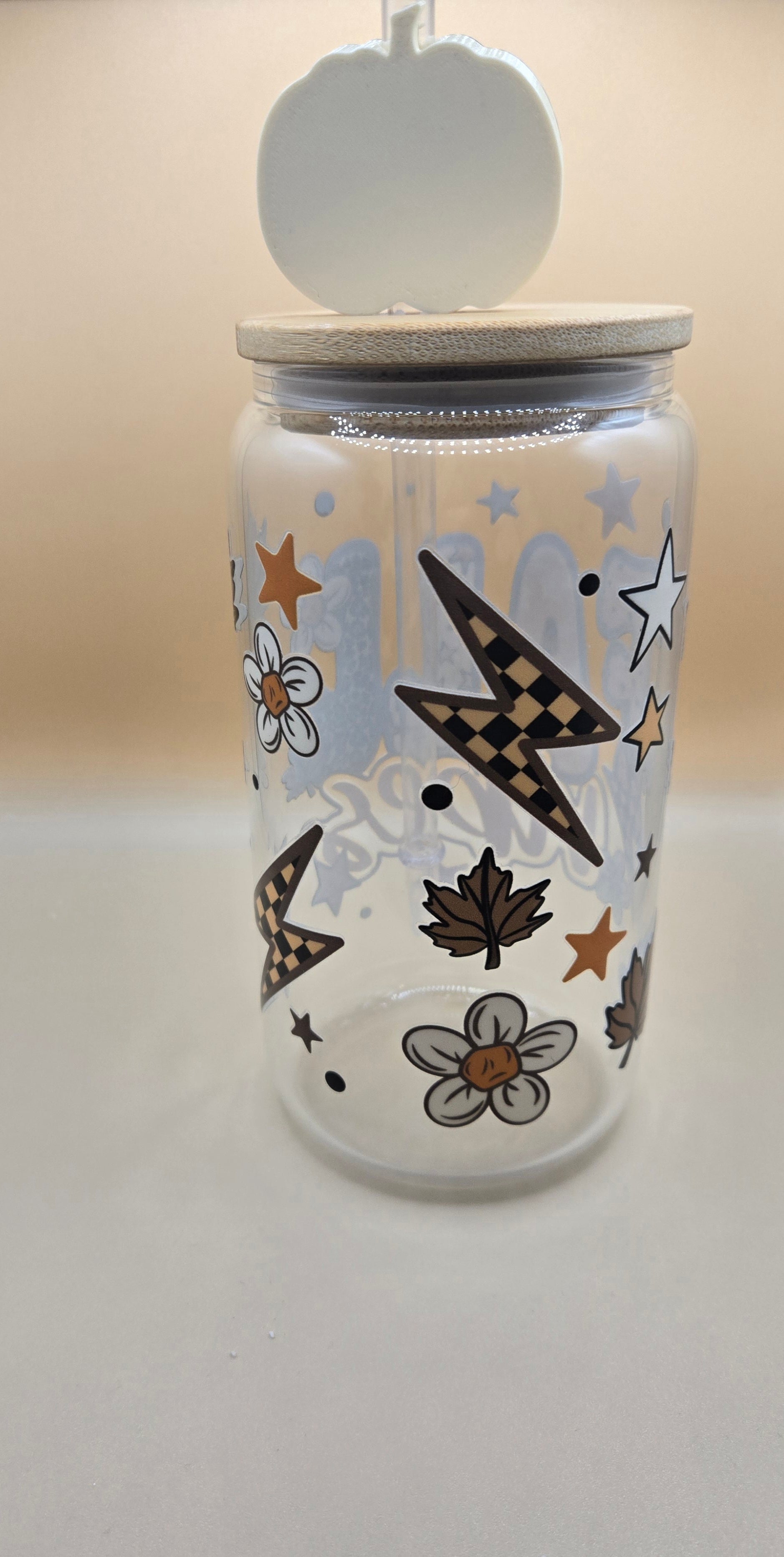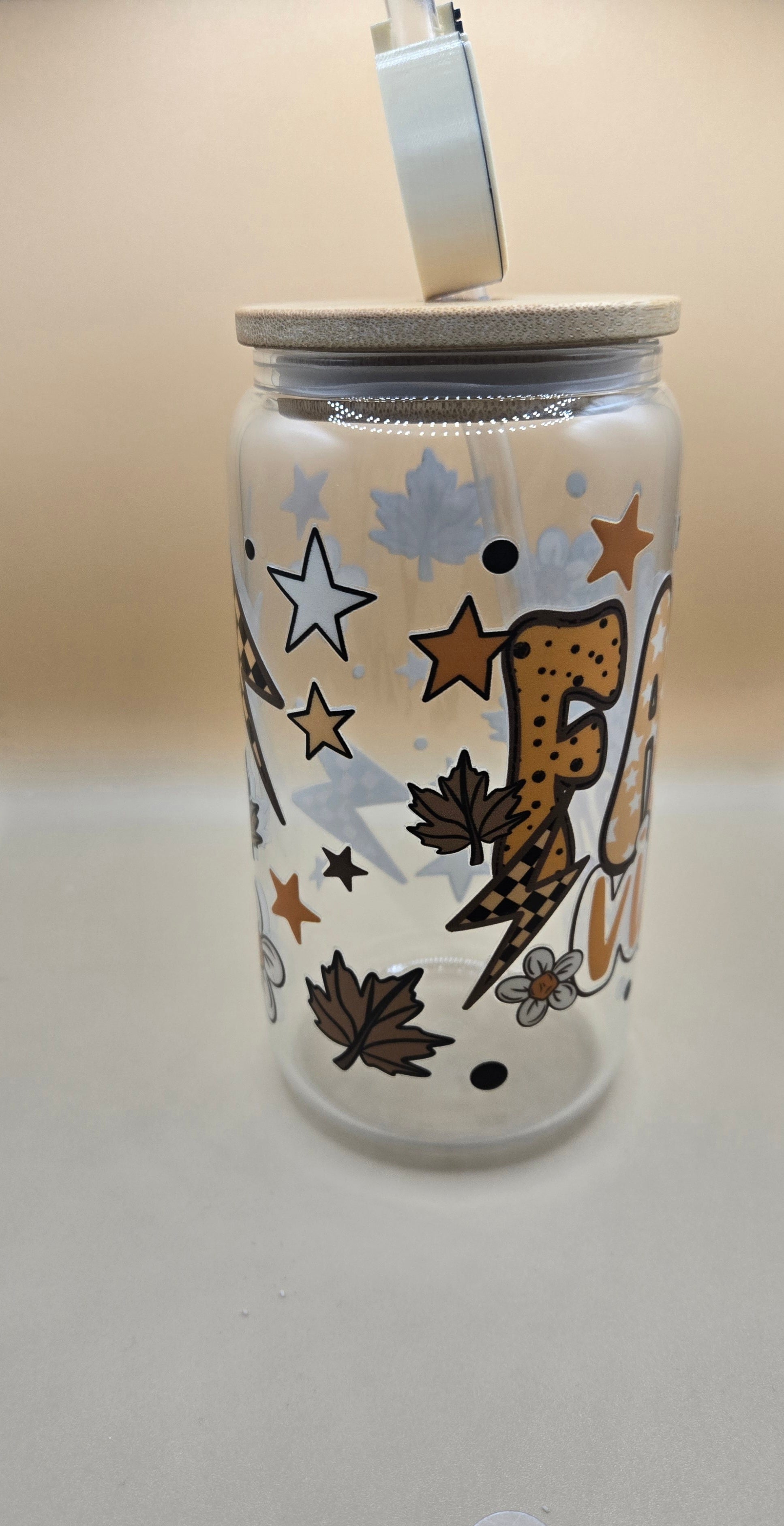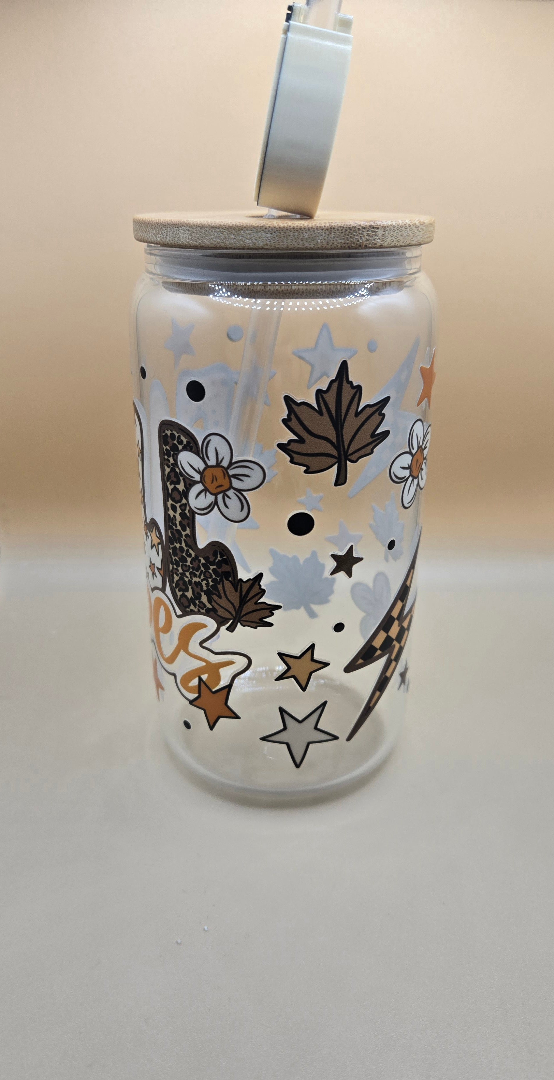16 oz Glass Cup with Bamboo Lid and Plastic Straw with Straw Topper.
