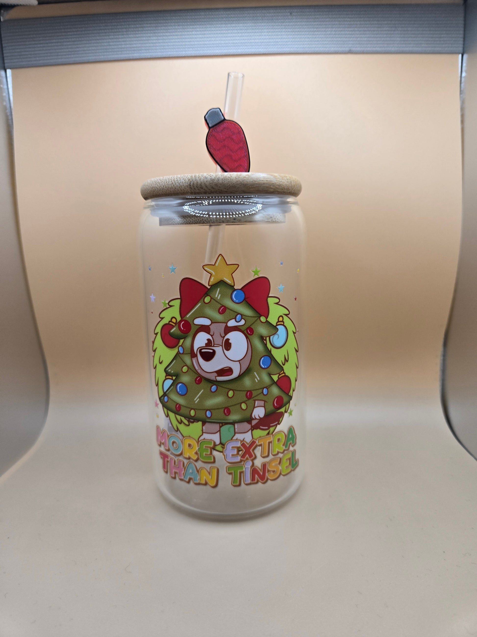 16 oz Glass cup with Holiday Bluey and straw topper.