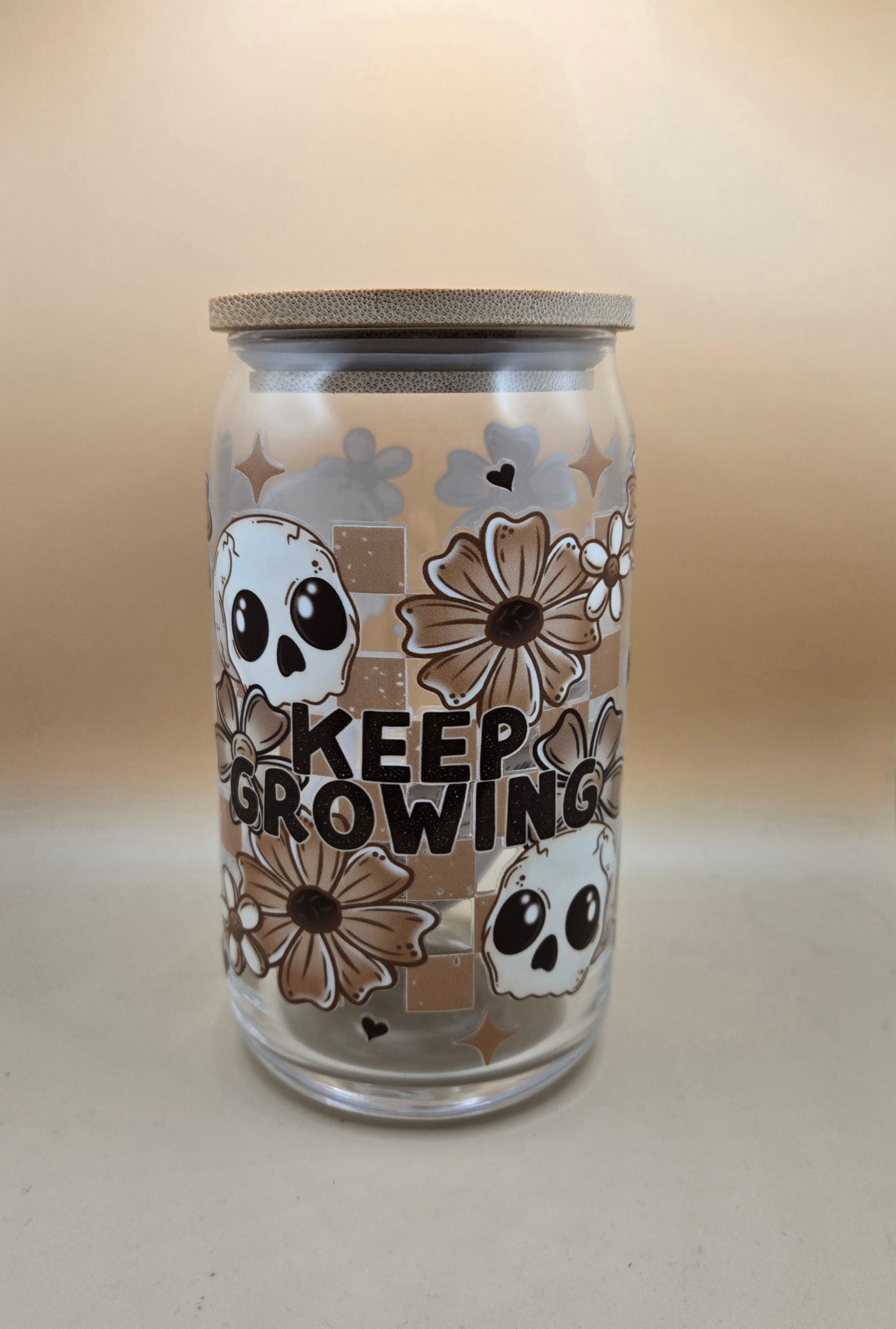 16 oz Glass Keep Growing. Comes with glass straw but if you want plastic please let us know.