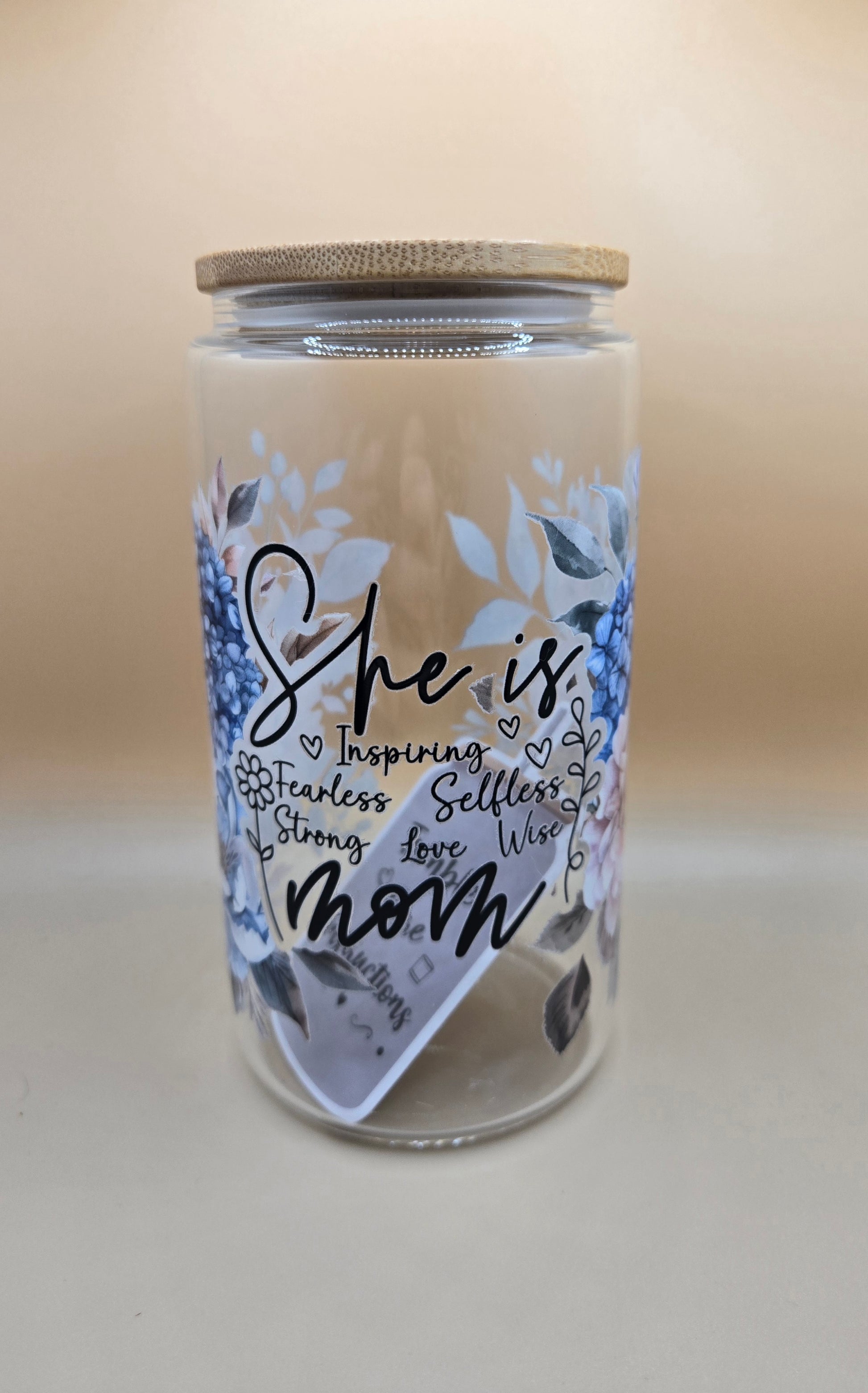 16 oz Glass She is Mom. Comes with glass straw but if you want plastic please let us know.