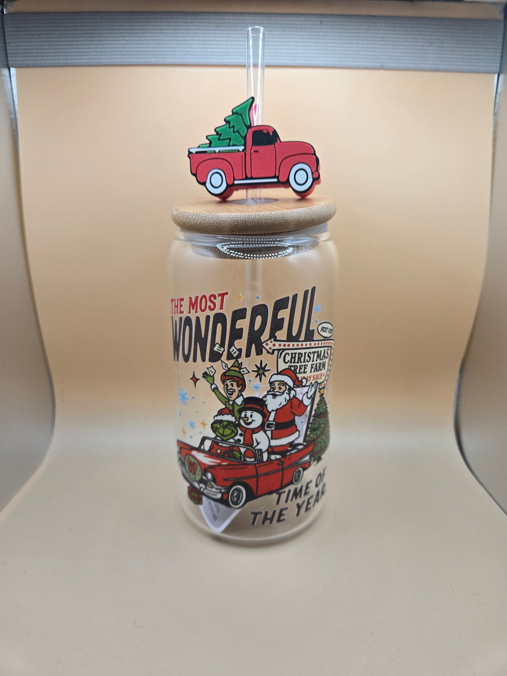 16 oz Glass cup, Its the most wonderful time of year with Straw topper.