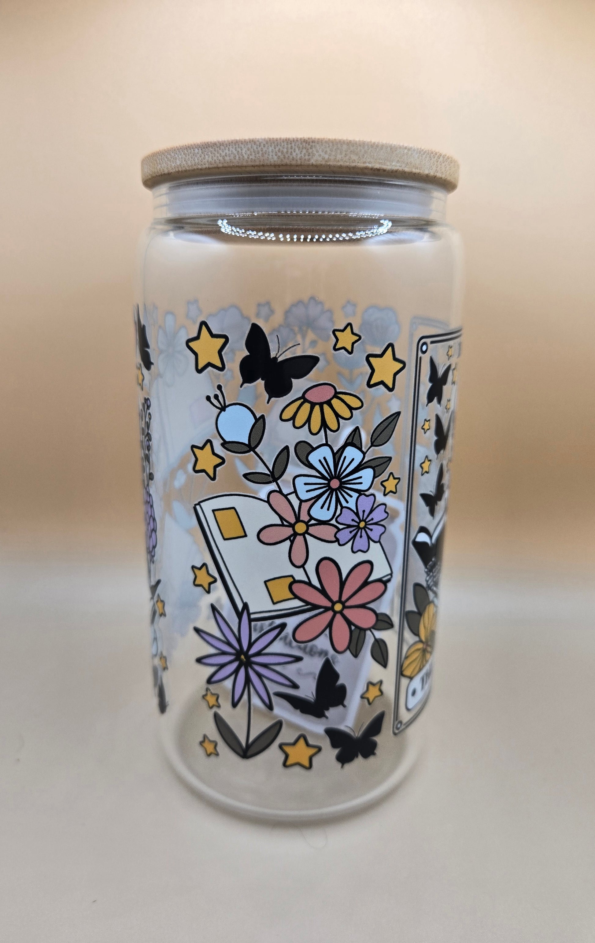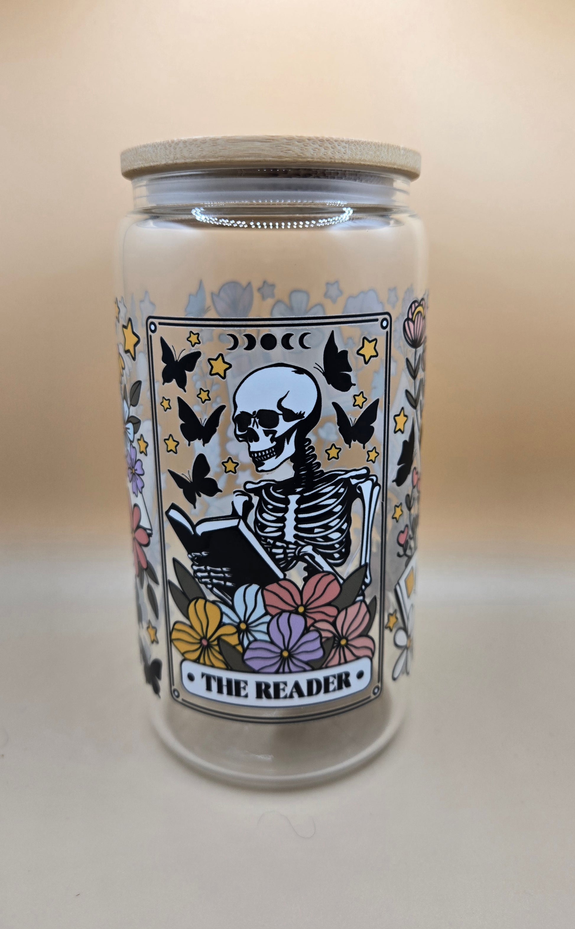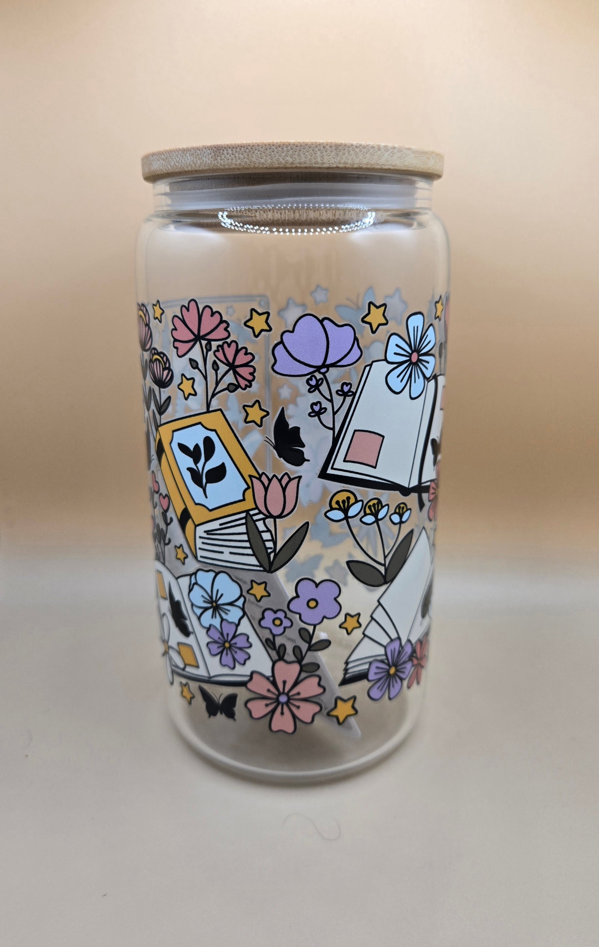 16 oz Glass The Reader. Comes with glass straw but if you want plastic please let us know.